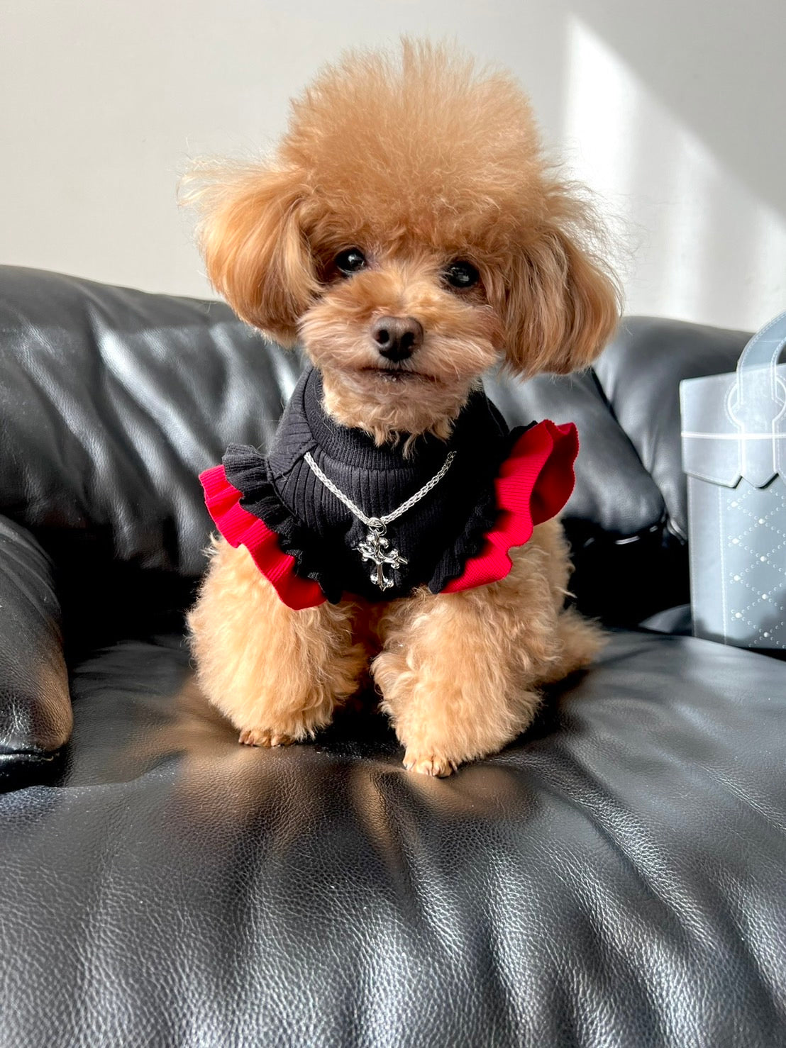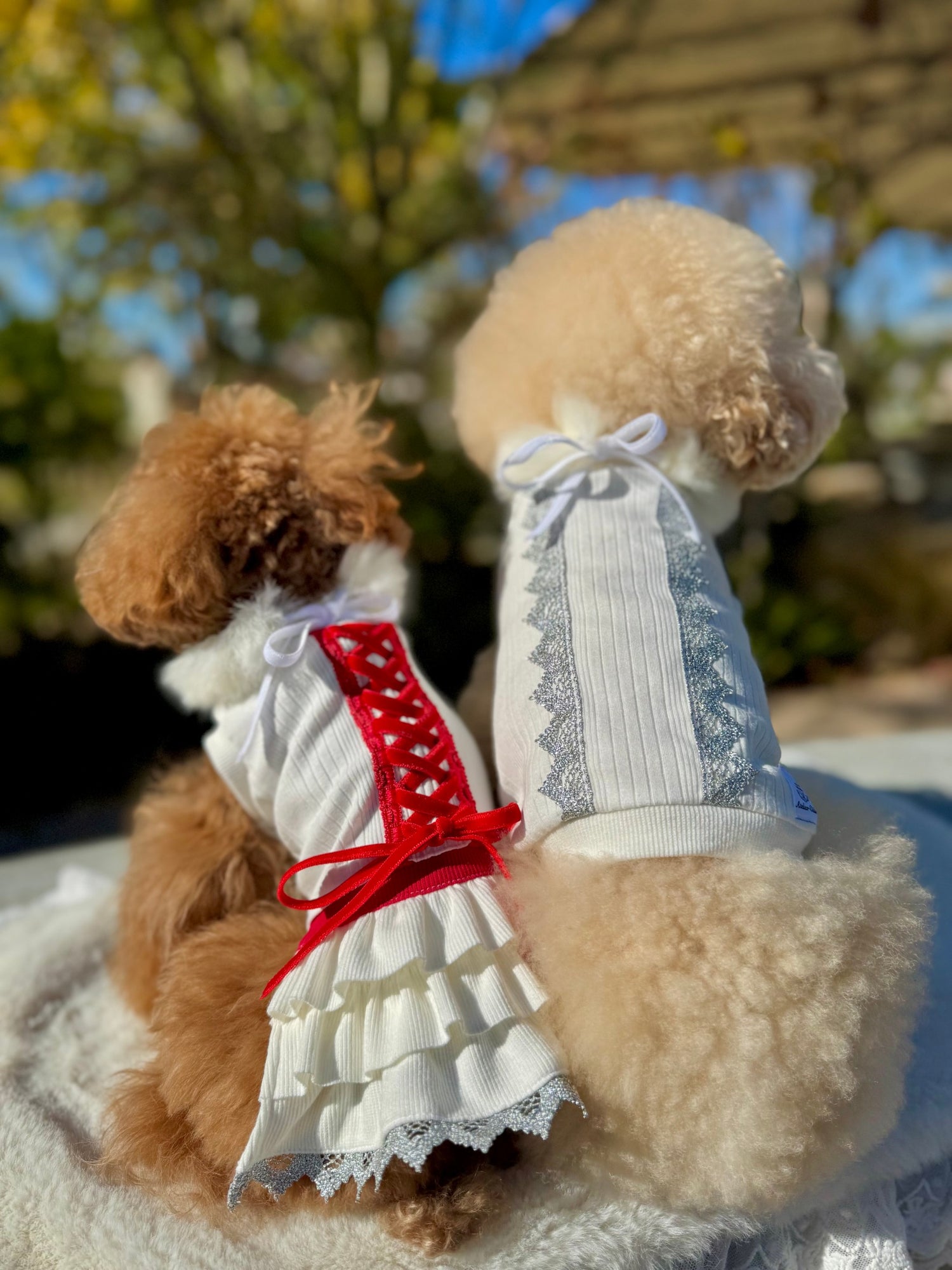 スカート部分のあるワンピースタイプのWanドレスです。スカートのタイプも数種類ございます。エレガントなワンピーススタイルをお楽しみ下さい。全て型紙からお作りするオーダーメイドで愛犬のぴったりサイズをお届けします。