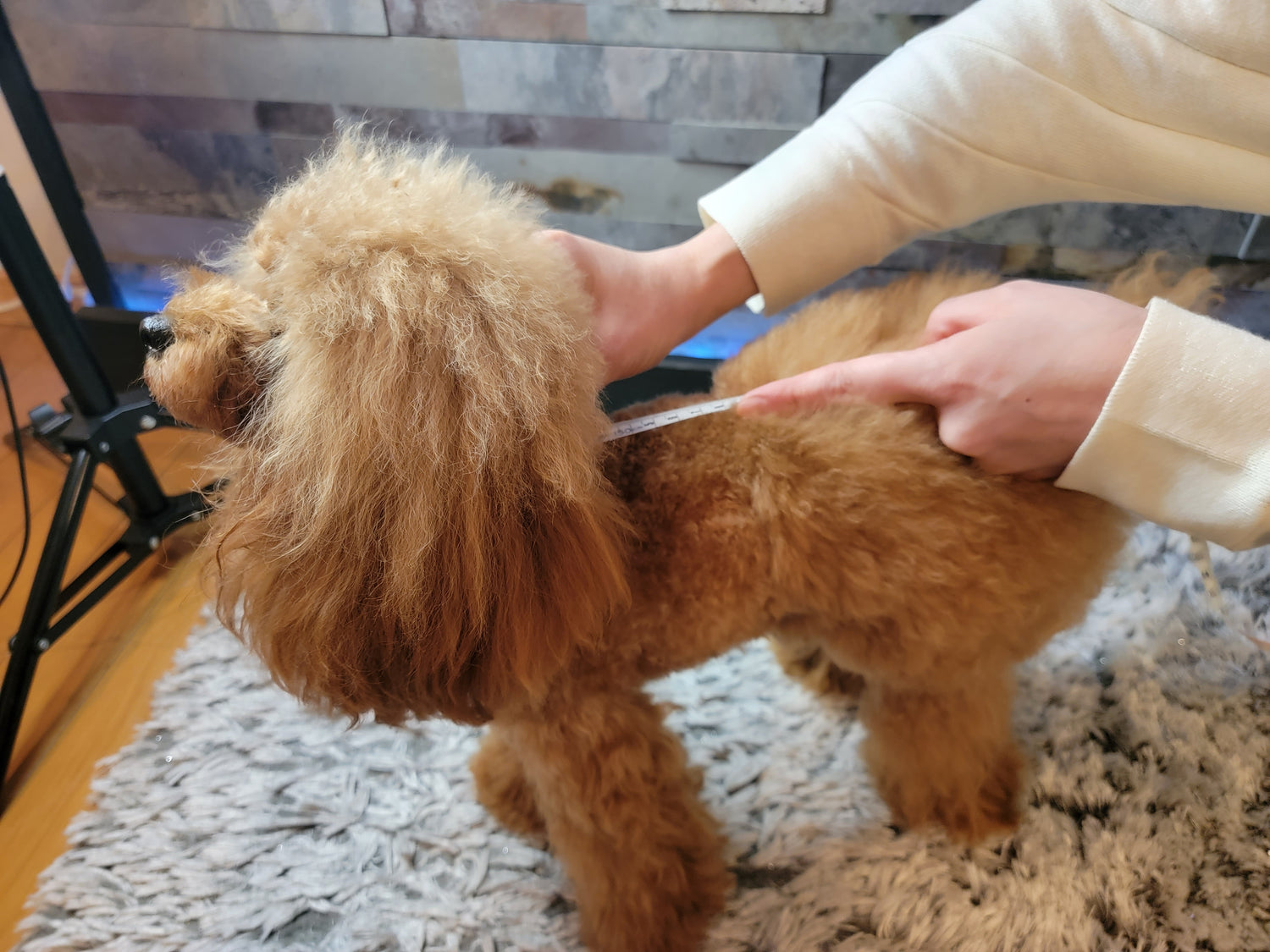オーダー時の採寸はお客様ご自身にお願いしております。裁縫用メジャー等の柔らかい測定器具でワンちゃんのヌードサイズ(服のサイズではなく、あくまでもワンちゃんの身体の実寸をお測り頂きます。なお、お測り頂いた数値を元にドレスサイズを決定、型紙の作成を行います。毛の厚み、フィット感等の調整はデザイナーが調整しますので、採寸部分の毛をできるだけ押さえて、ワンちゃんのヌードサイズをお測り頂くのが、フィット感抜群のドレスを作るポイントとなります。